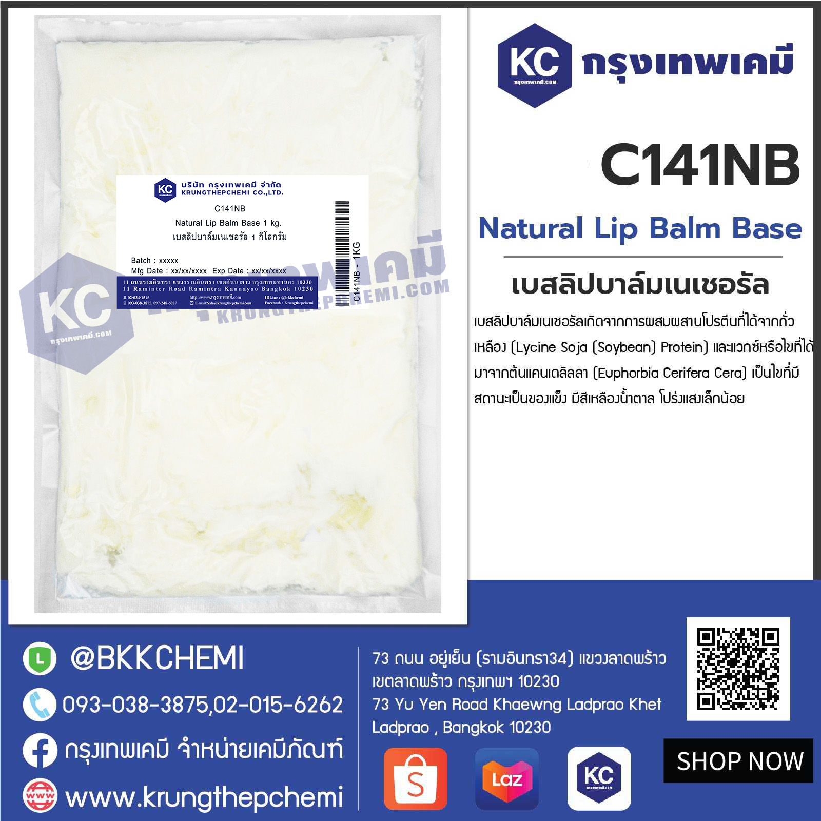 ชื่อทั่วไป : Cera Alba, Cetearyl alcohol, Glycine Soja Lipids, Euphorbia Cerifera Cera, Lauryl Laurate / Natural Lip Blam Base NB-535